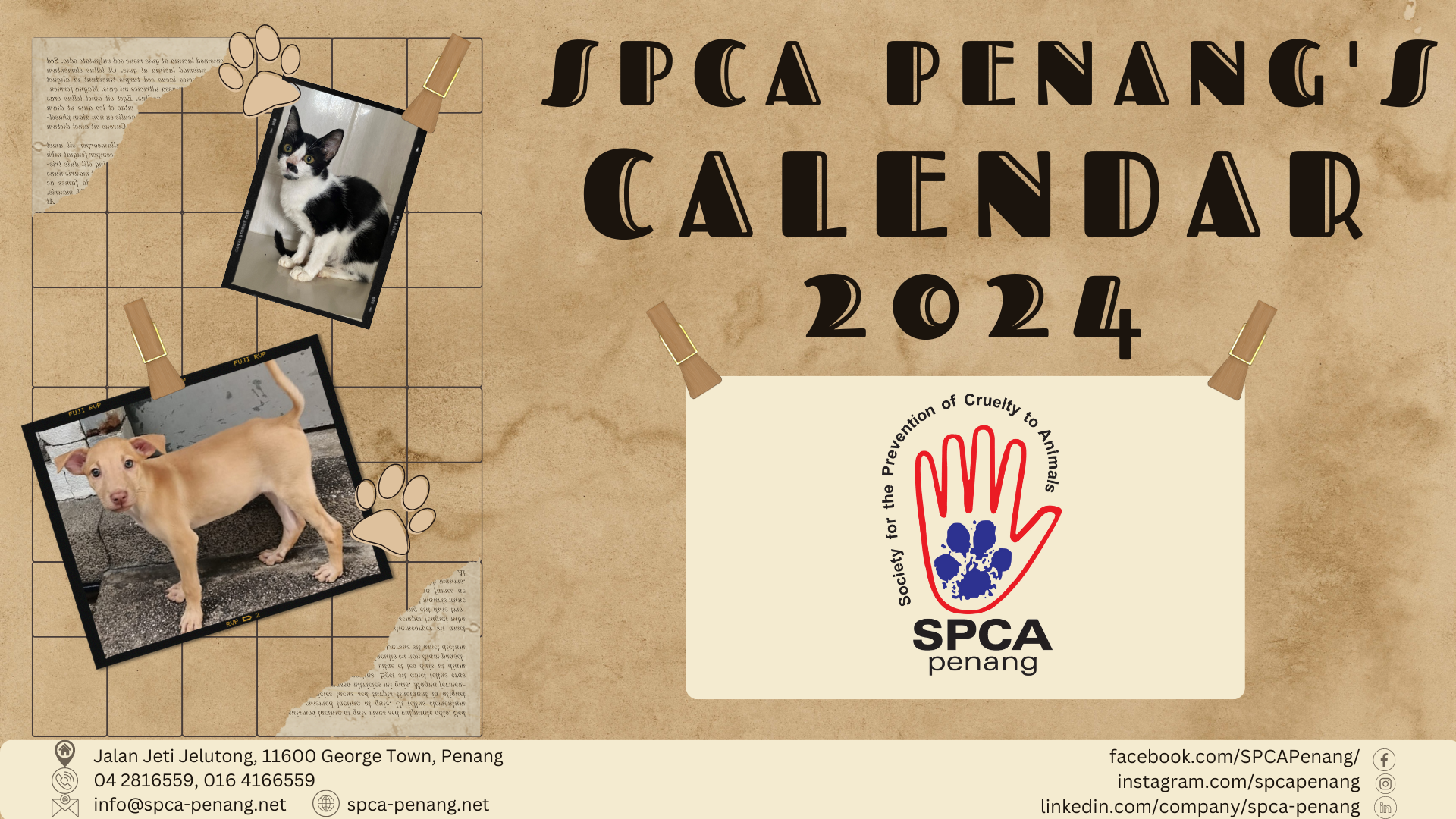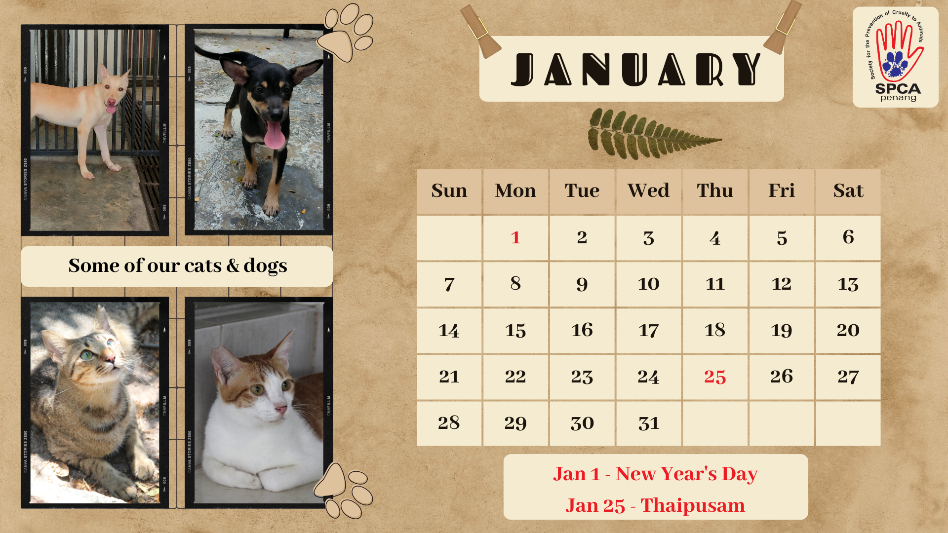 But fear not, we have developed three designs of digital calendars. We can send to you electronically and you may distribute “as is” free of charge, but for a minimum donation of RM50 for designs 1 and 2 and RM500 for design 3, we will customize the artwork using photos you provide. Text can be modified, but we will retain our logo and “SPCA Penang” on the artwork to help promote our shelter and create awareness. All funds received for donations for the calendar customization will be channeled to our neutering fund and a tax exempt receipt will be issued for all monetary donations.